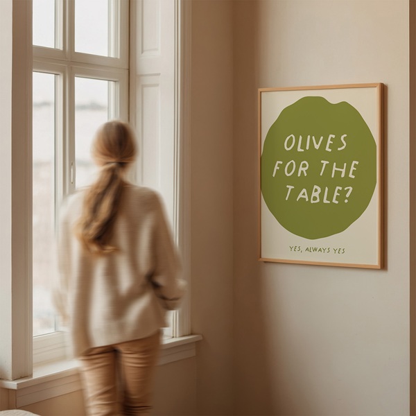 One of the highlights of the collection is the Coffee and Croissants Print. It combines soft illustration with simple typography which creates a warm and relaxed cafe inspired mood. It works especially well above a coffee station or breakfast nook. The Yes Chef Print is another favourite. It adds a fun and energetic tone to the room and makes a great conversation piece for anyone who enjoys cooking. For something more Mediterranean inspired, the Olives Kitchen Print brings a fresh and rustic feel that pairs well with wooden textures and natural colours.