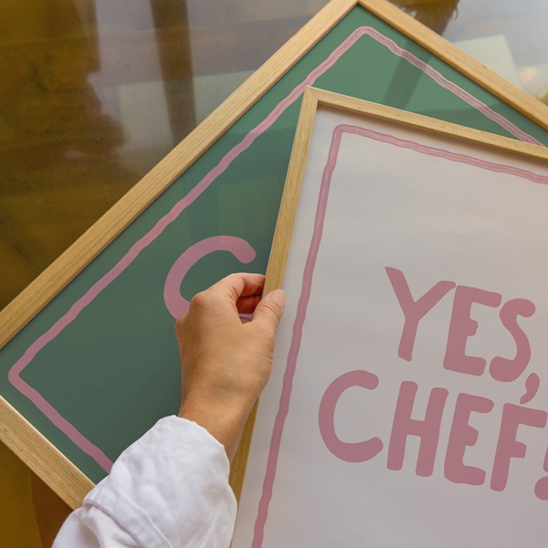 • Create a small gallery wall. Pair the Yes Chef Print with the Olives Kitchen Print and another typography design for a balanced, stylish cluster.